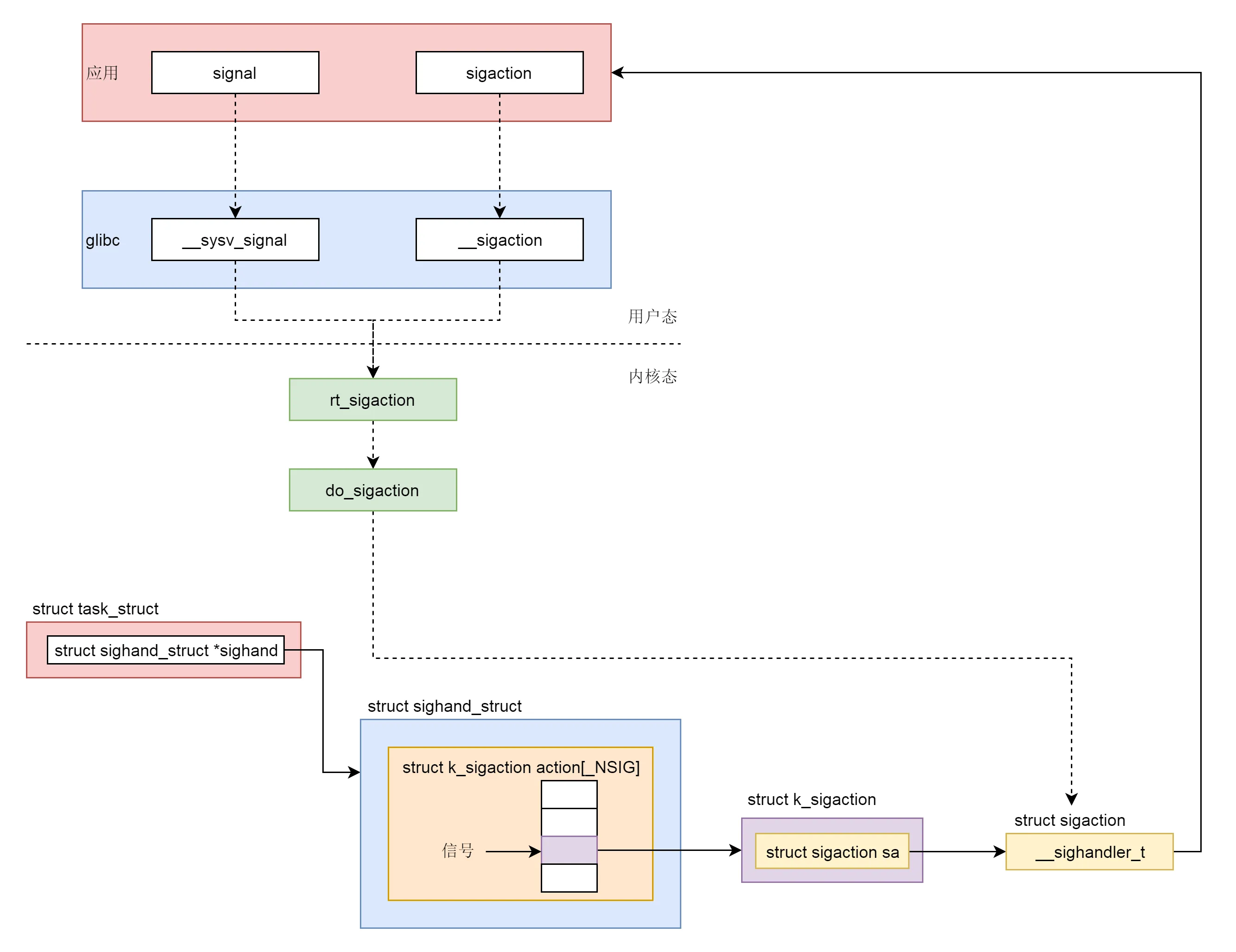 do_sigaction 就是设置 sighand 里的信号处理函数。int do_sigaction(int sig, struct k_sigaction *act, struct k_sigaction *oact)